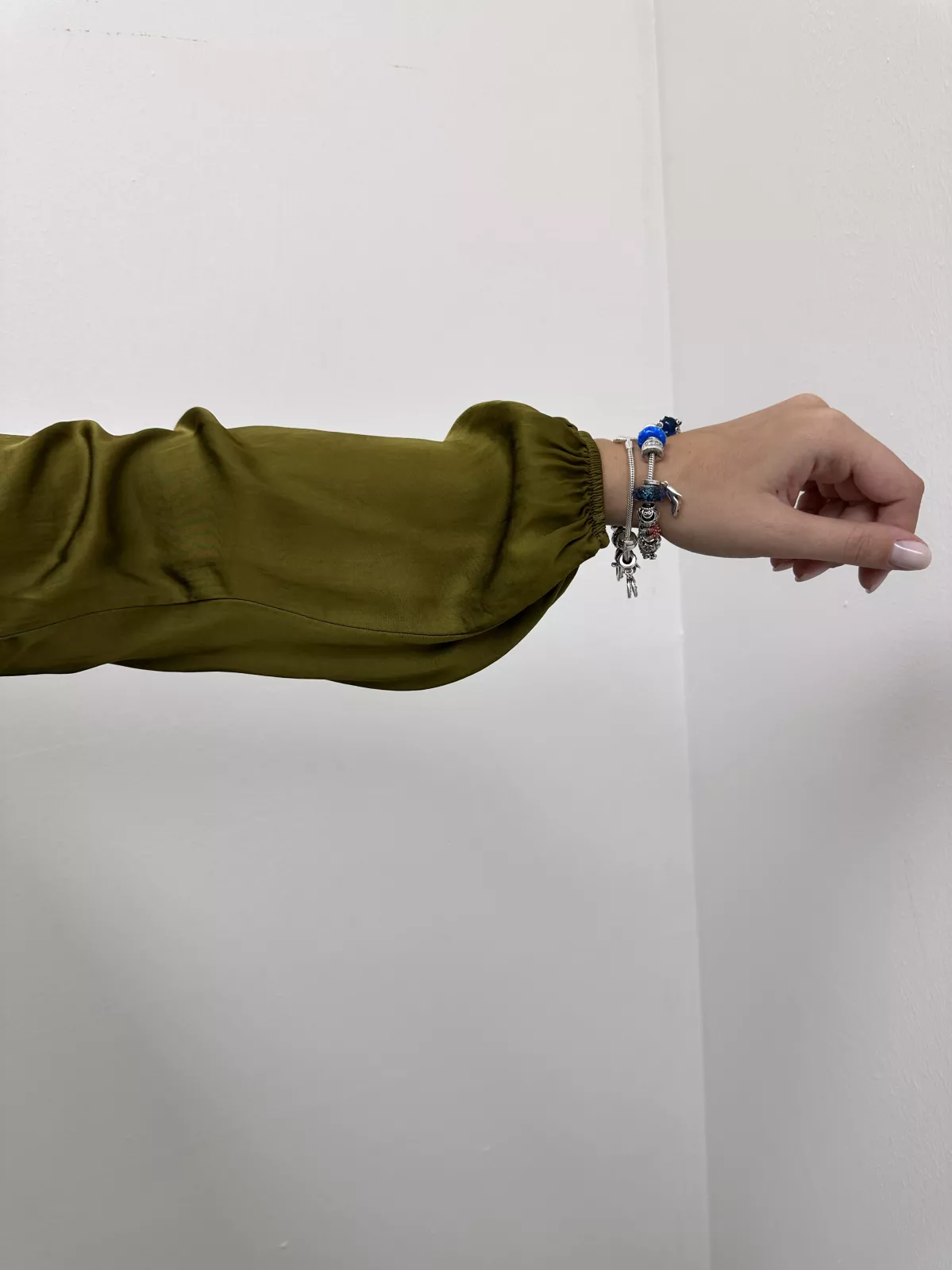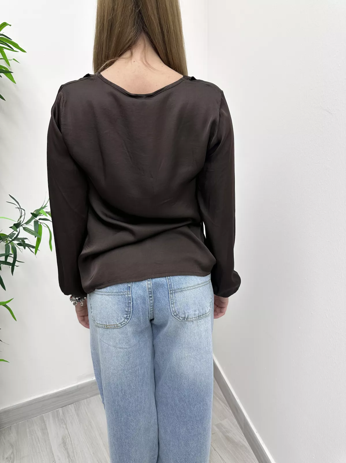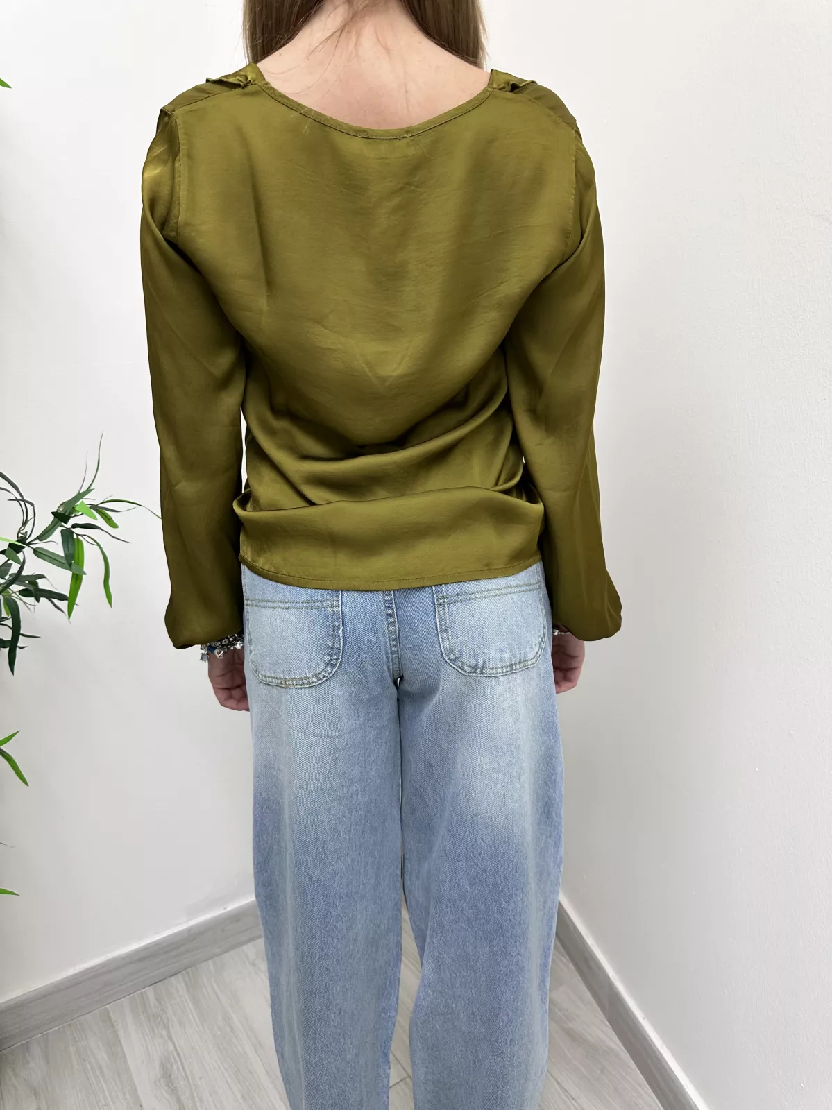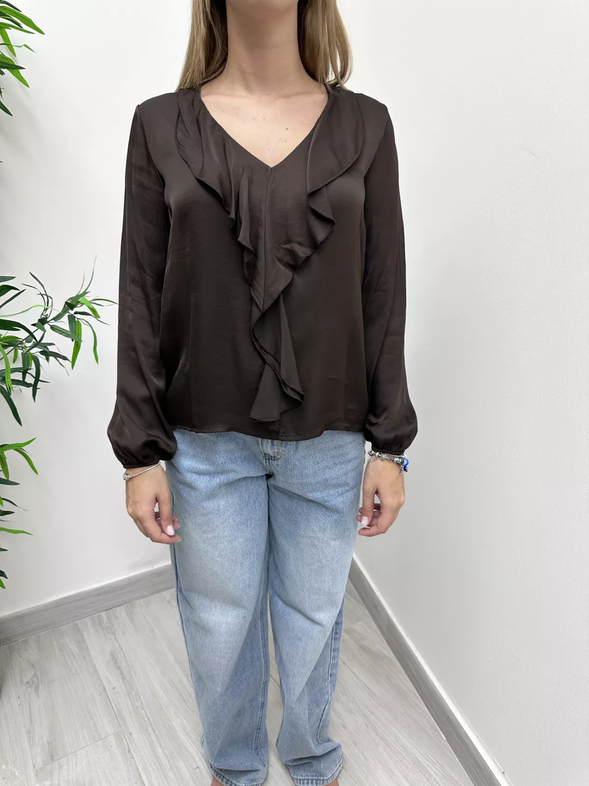 Blusa in raso satinata con volant sul davanti.Scollo a V.