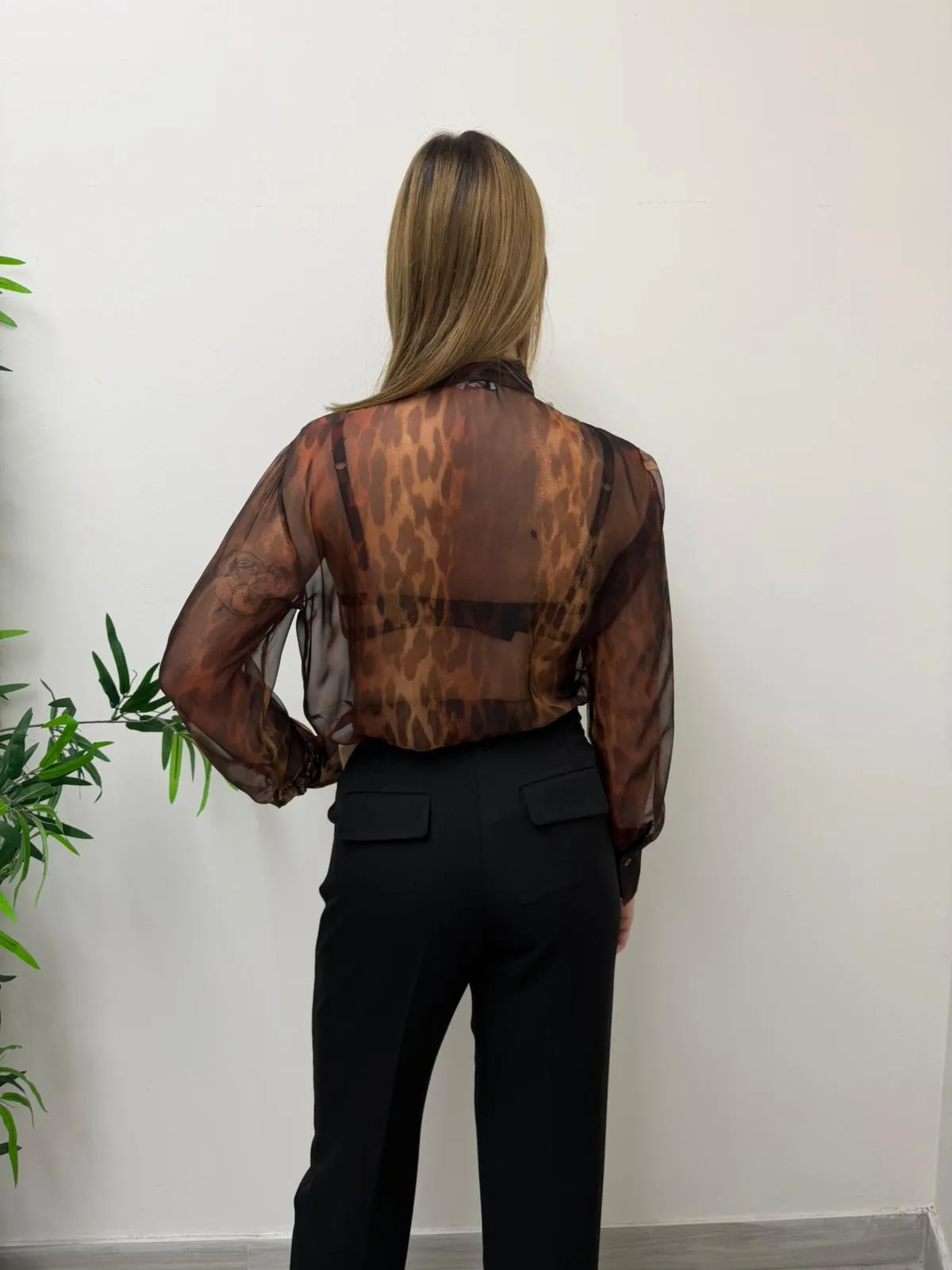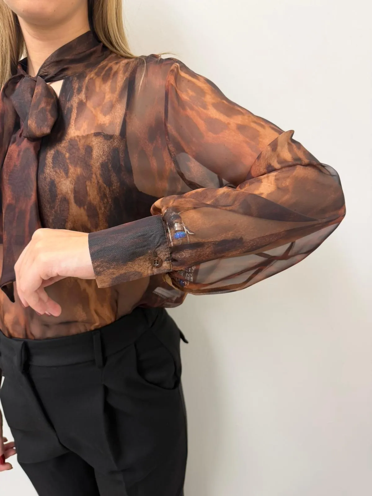 Camicia maculata senza bottoni, semi trasparente con fiocco davanti.