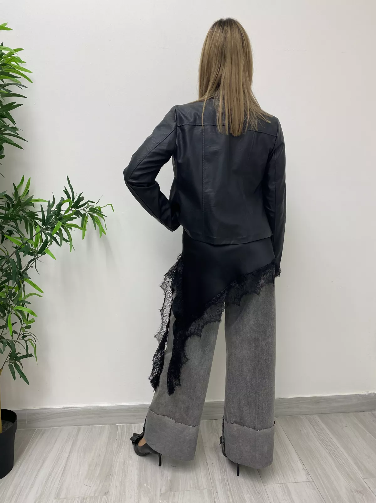Chiodo in ecopelle nero aderente. Lunghezza fino alla vita.