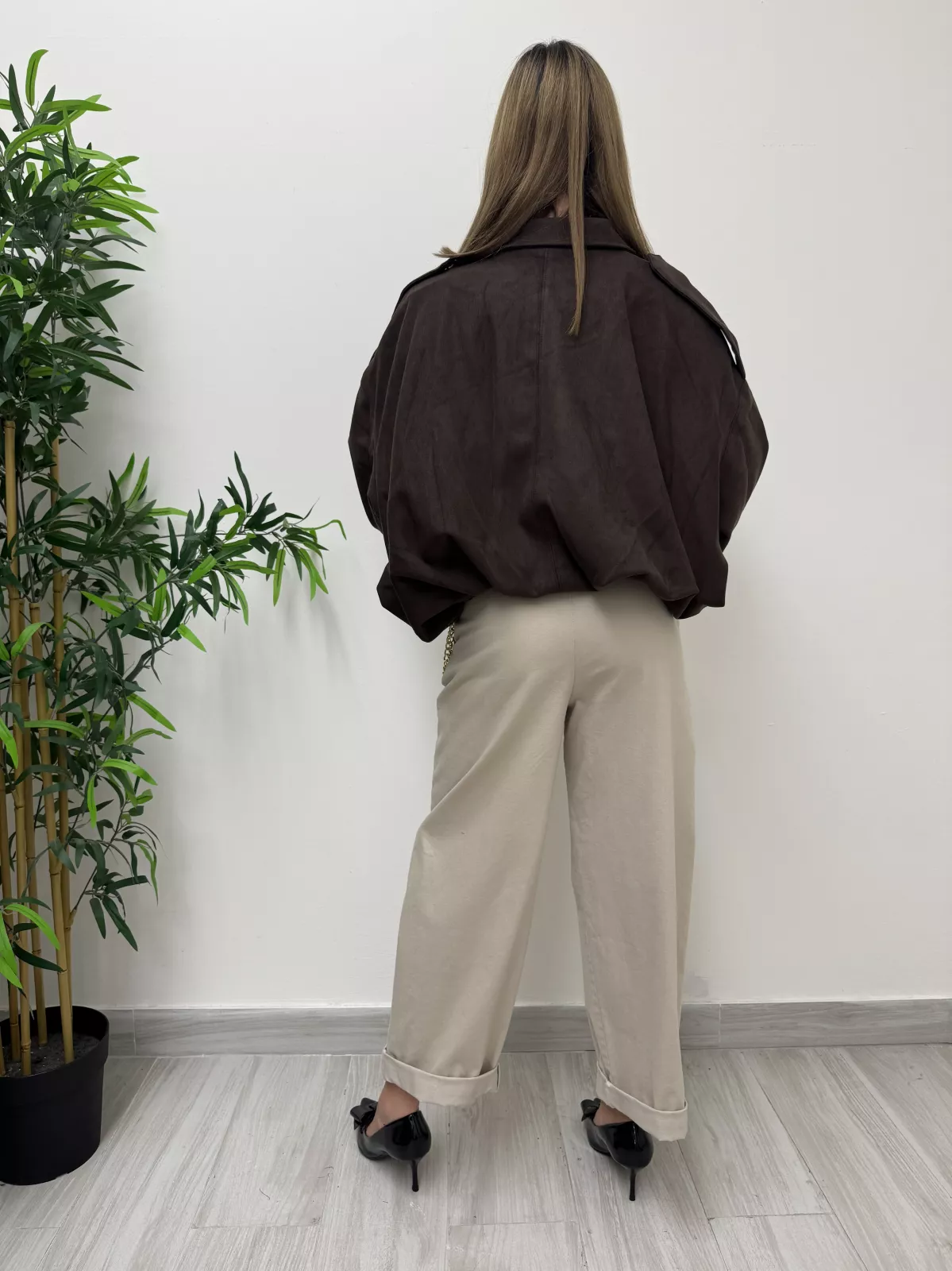Giacca corta scamosciata marrone con maniche a sbuffo e arricciatura in vita.