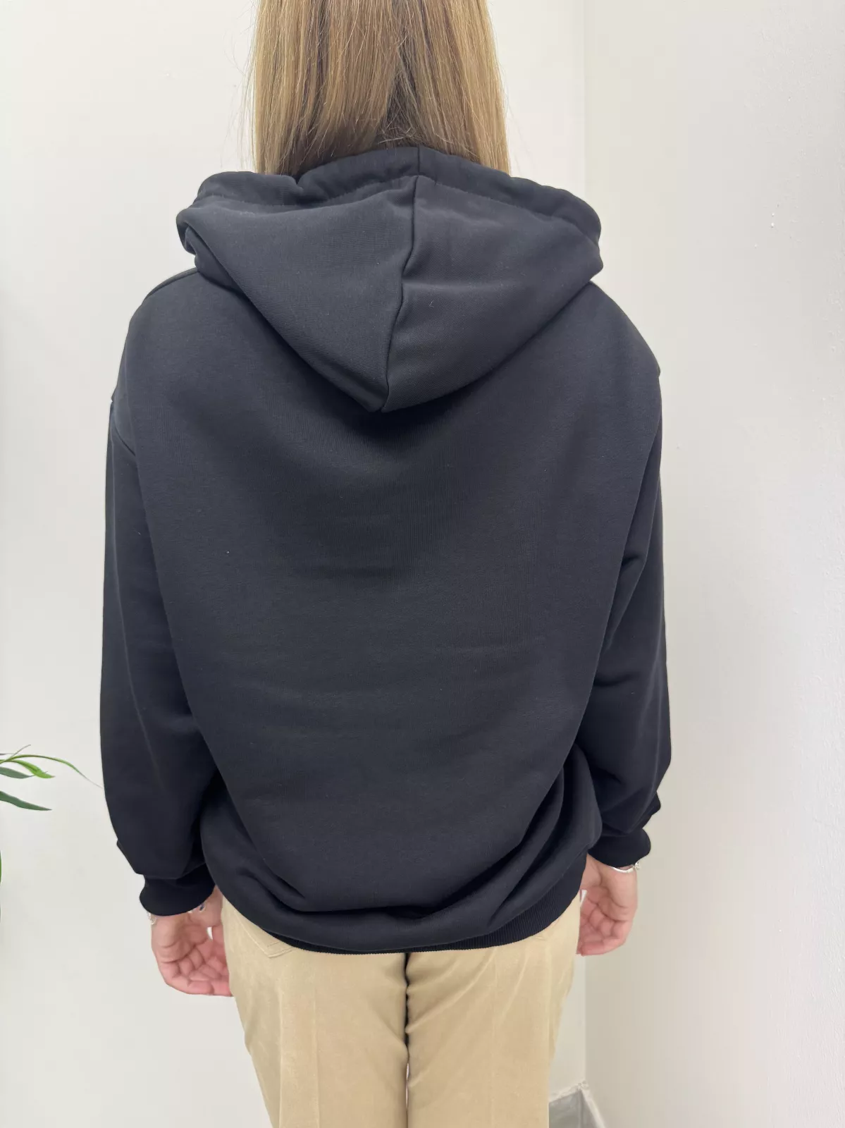 Felpa nera con cappuccio con stampa orsetto in rilievo e catenina oro presente sempre sul davanti.