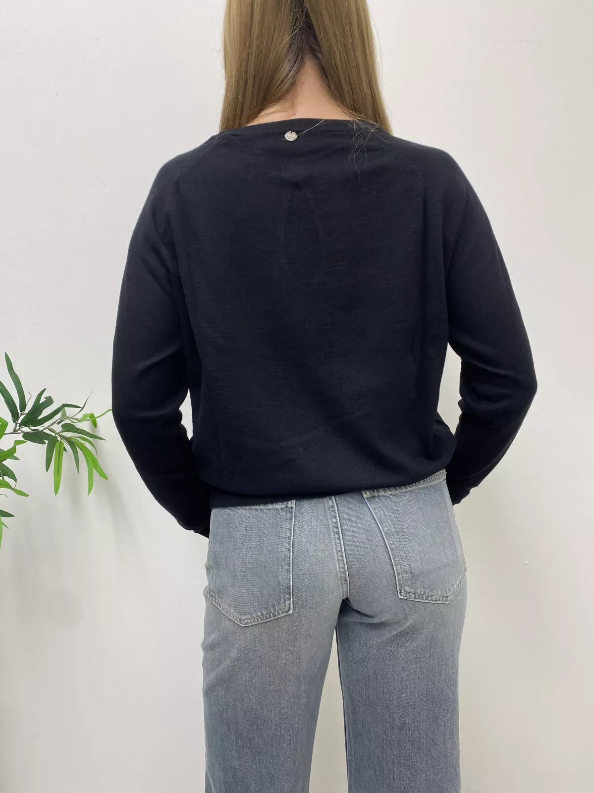 Maglione corto nero con apertura davanti con bottone gioiello argento.