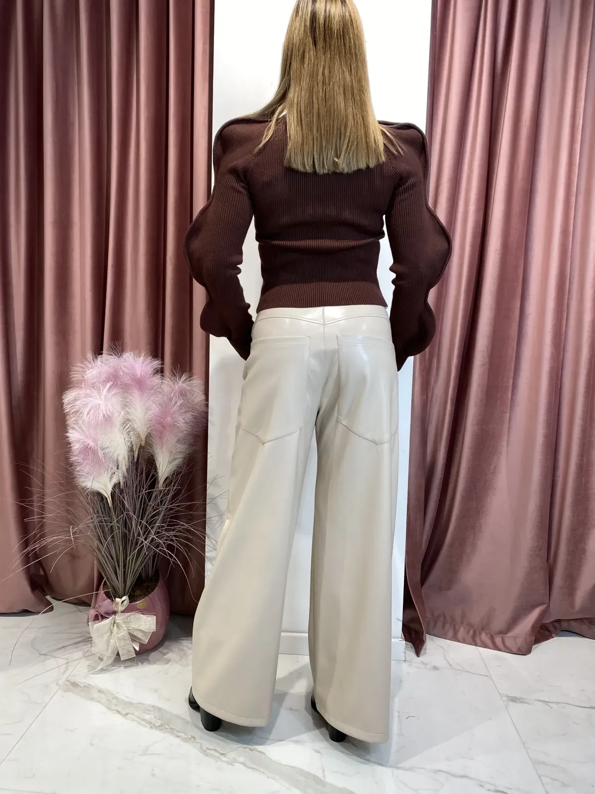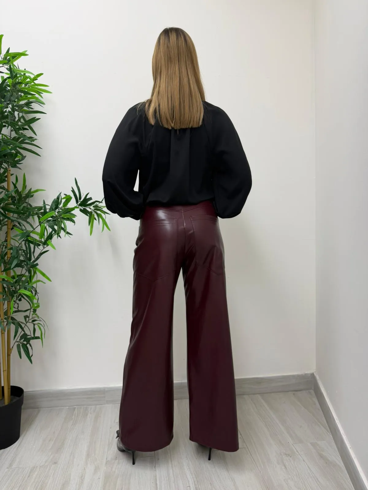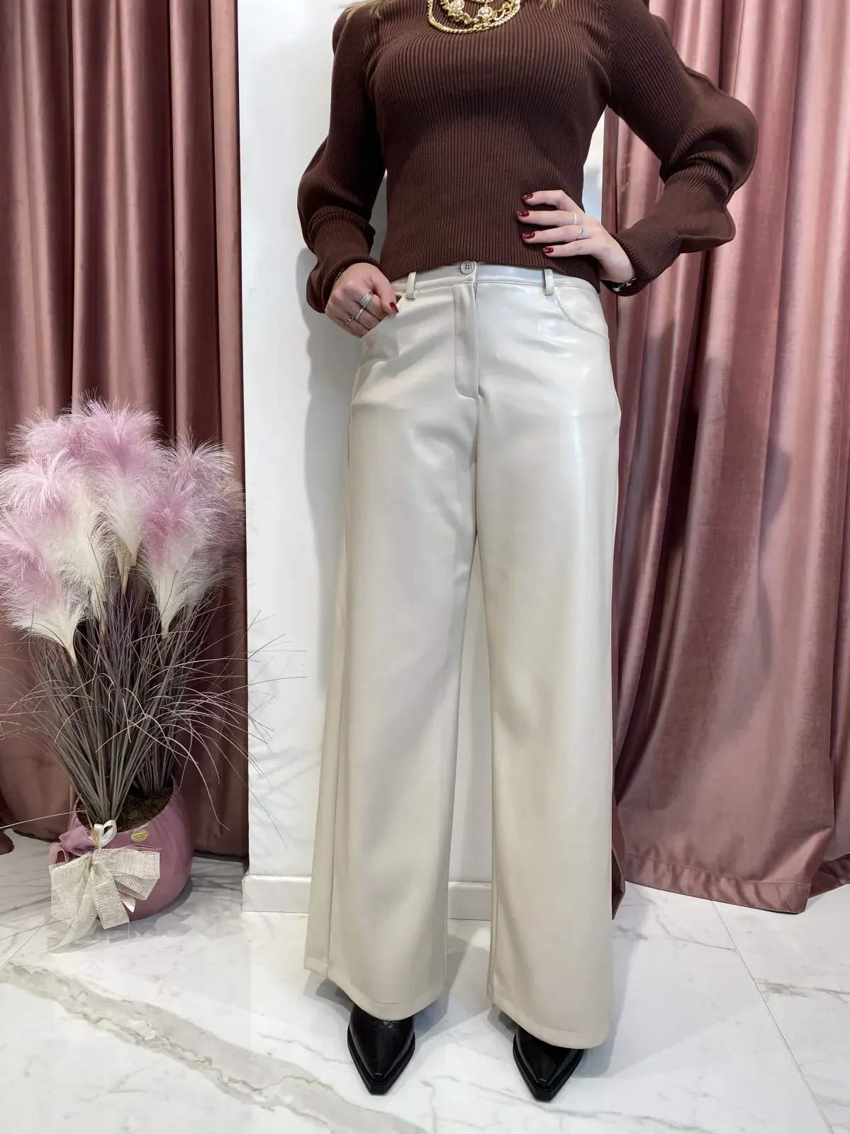 Pantalone in ecopelle a palazzo a vita alta con chiusura a bottone.Tasche davanti e dietro.