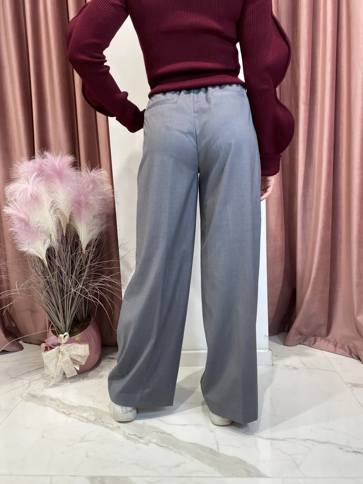 Pantaloni a palazzo elasticizzati in vita con tasche davanti e finte tasche dietro.
