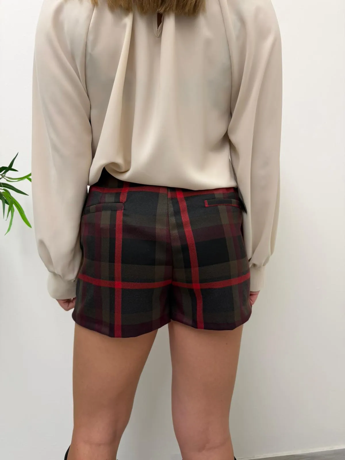 Pantaloncino a quadri con cintura nera e fibia oro.