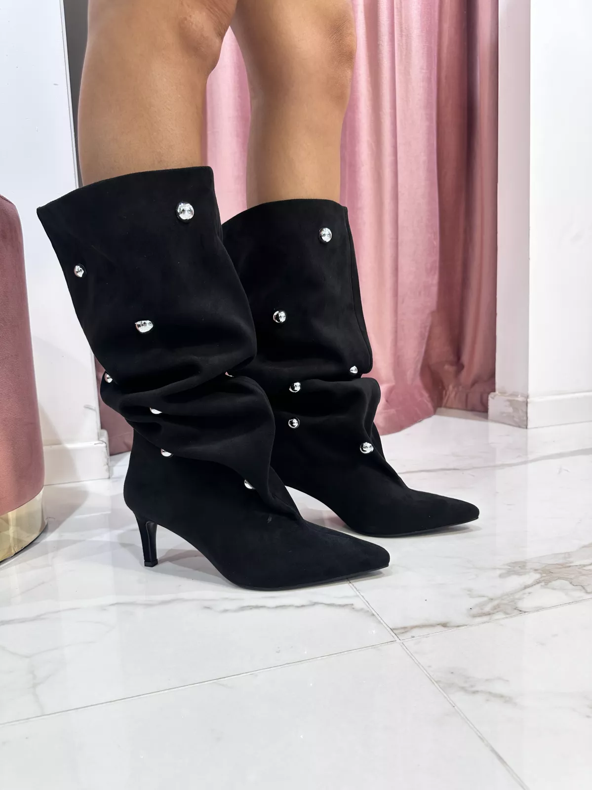 Stivale nero alto scamosciato con tacco a spillo. Decorato con borchie circolari argento