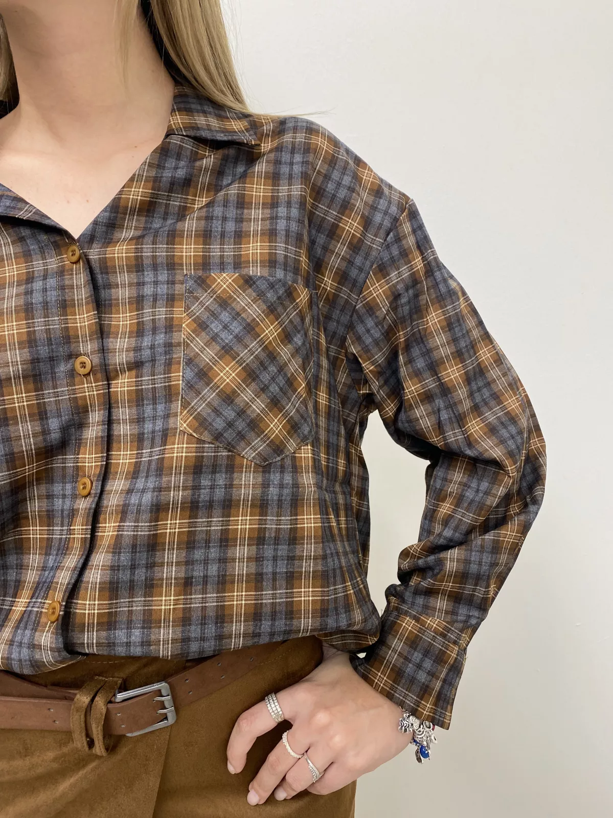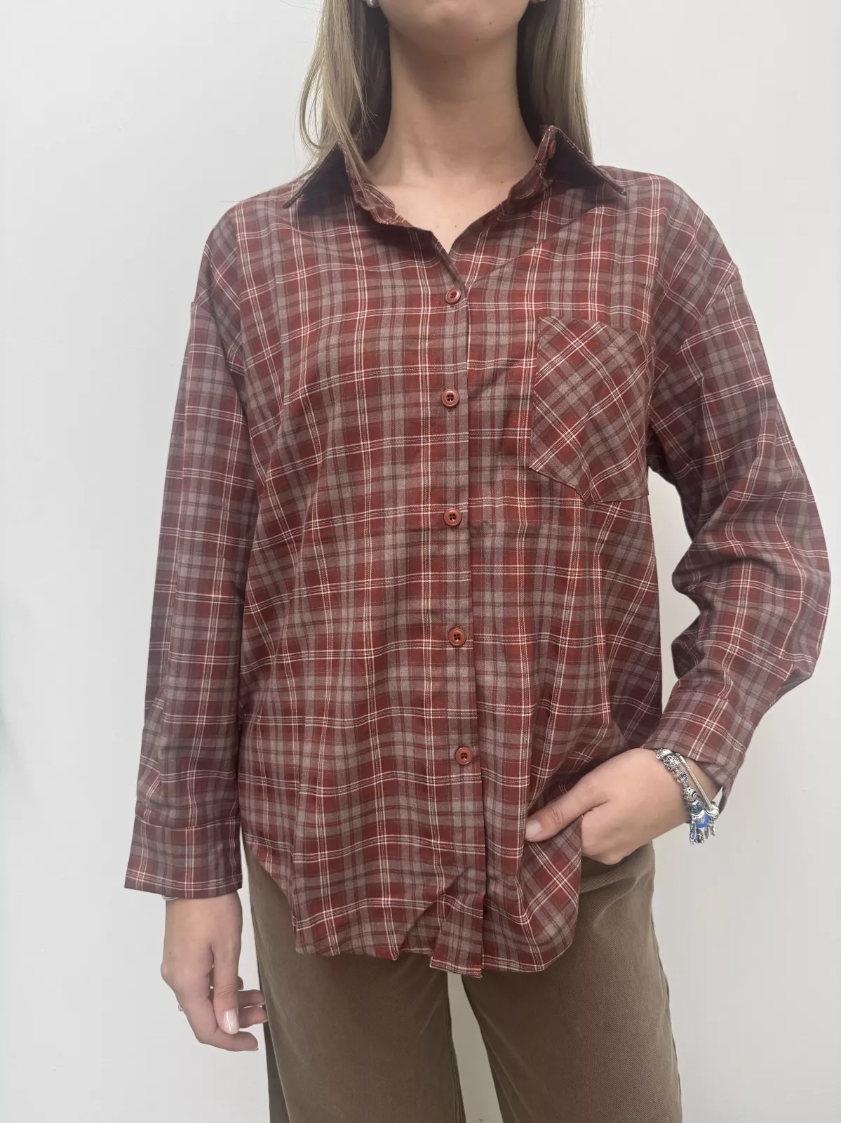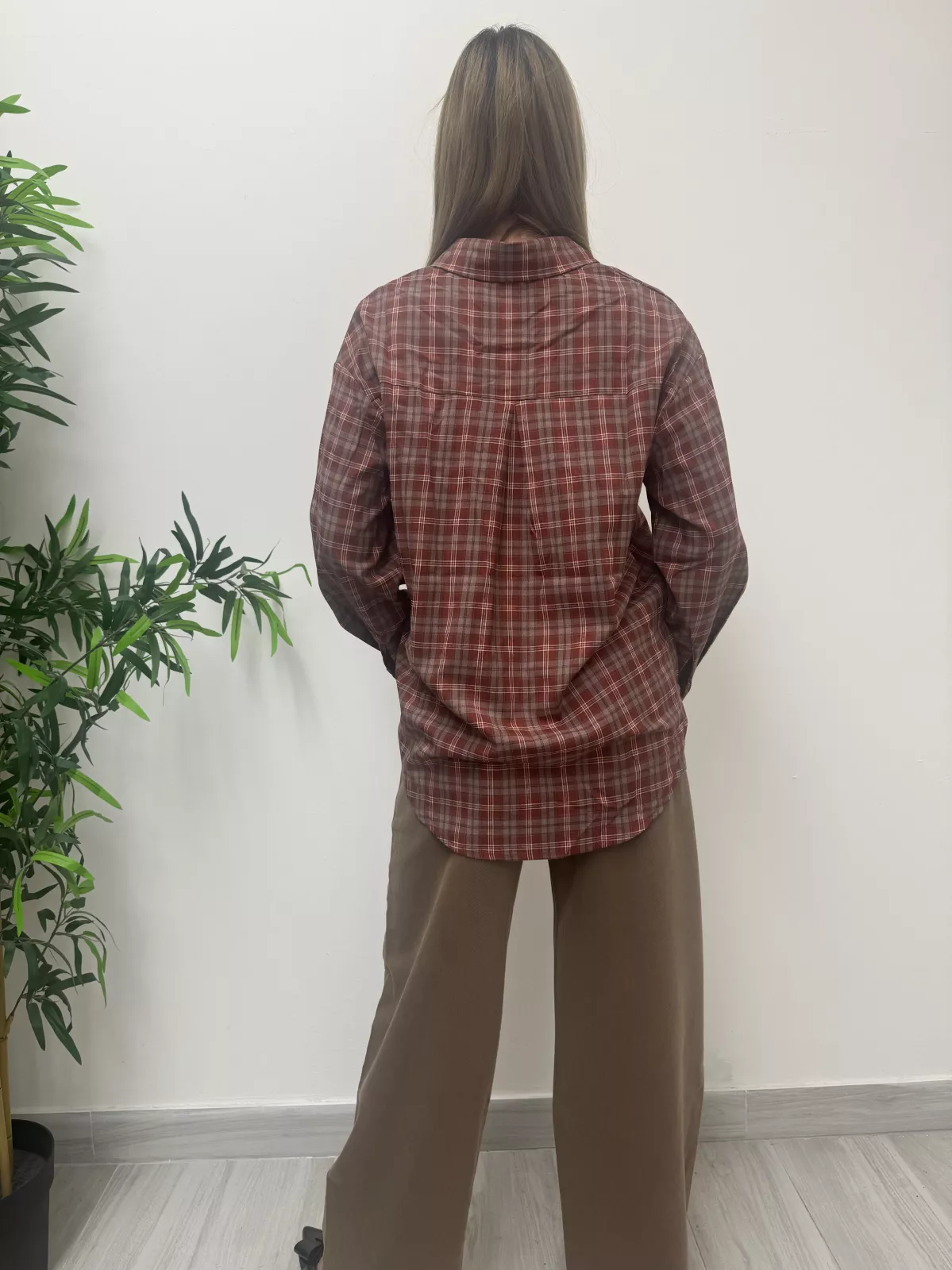 Camicia a manica lunga a quadri, abbottonata davanti e sulla manica. Scollo a girocollo con colletto e taschino laterale.