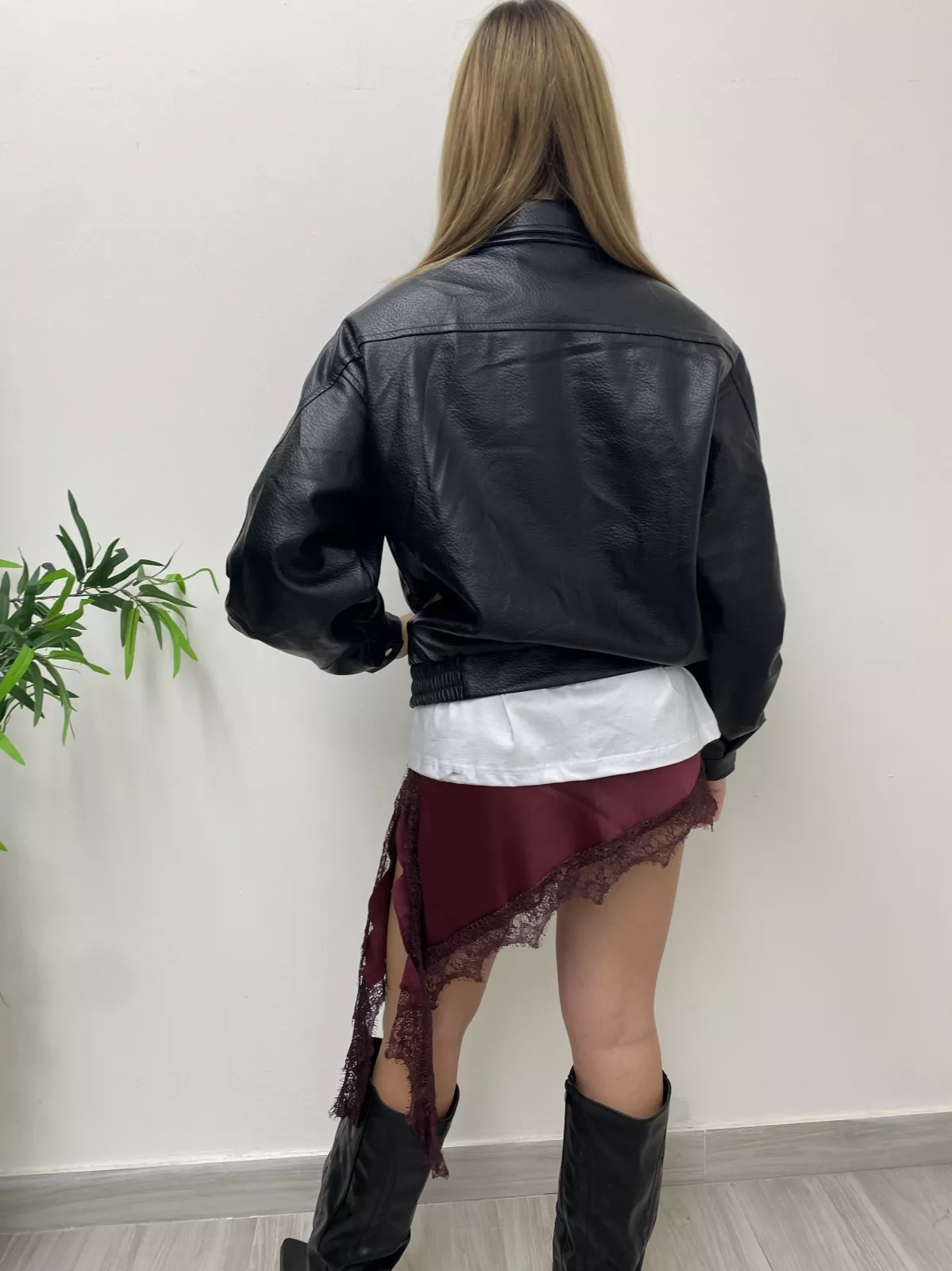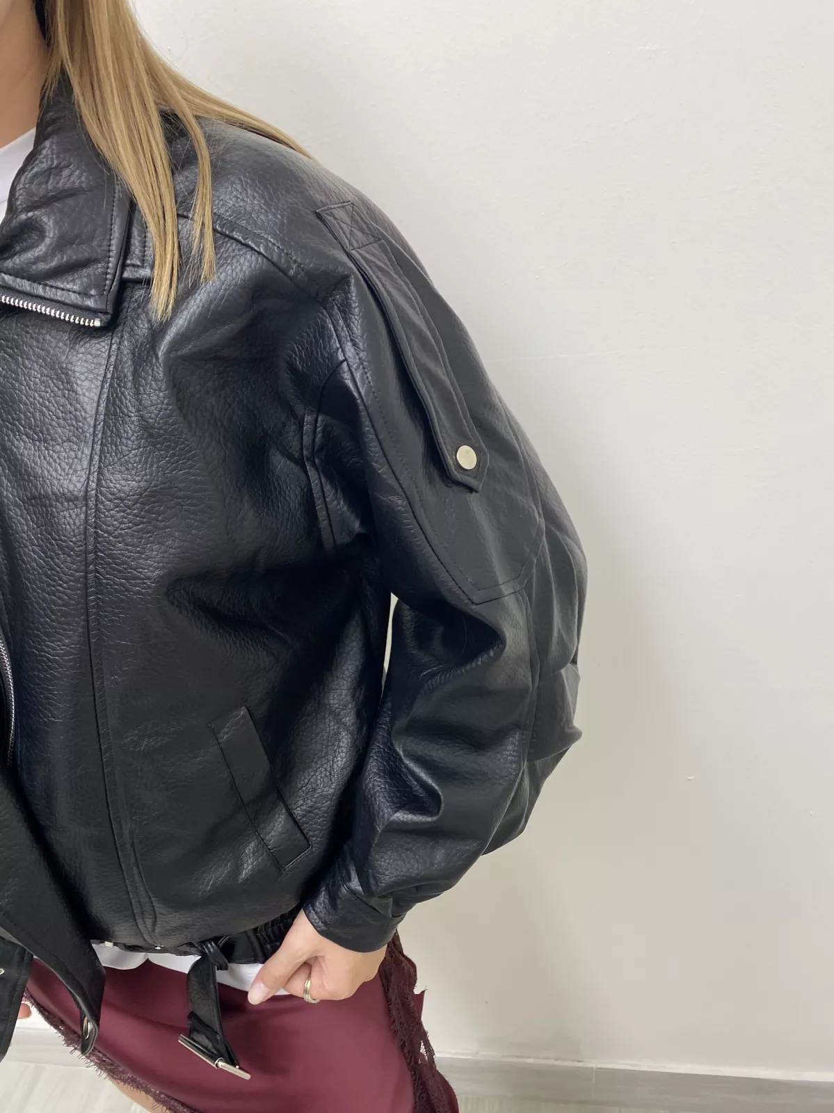 Giacca in ecopelle nera over con cinturino nella parte inferiore.