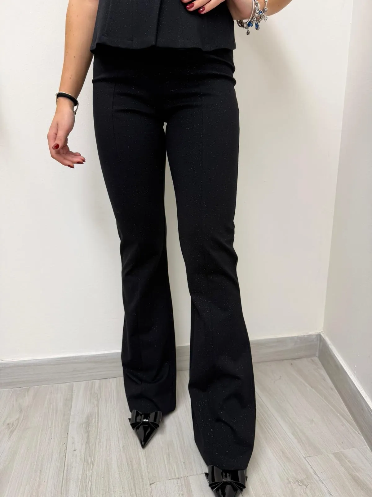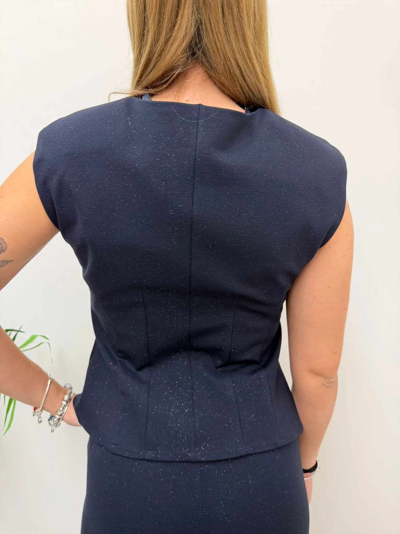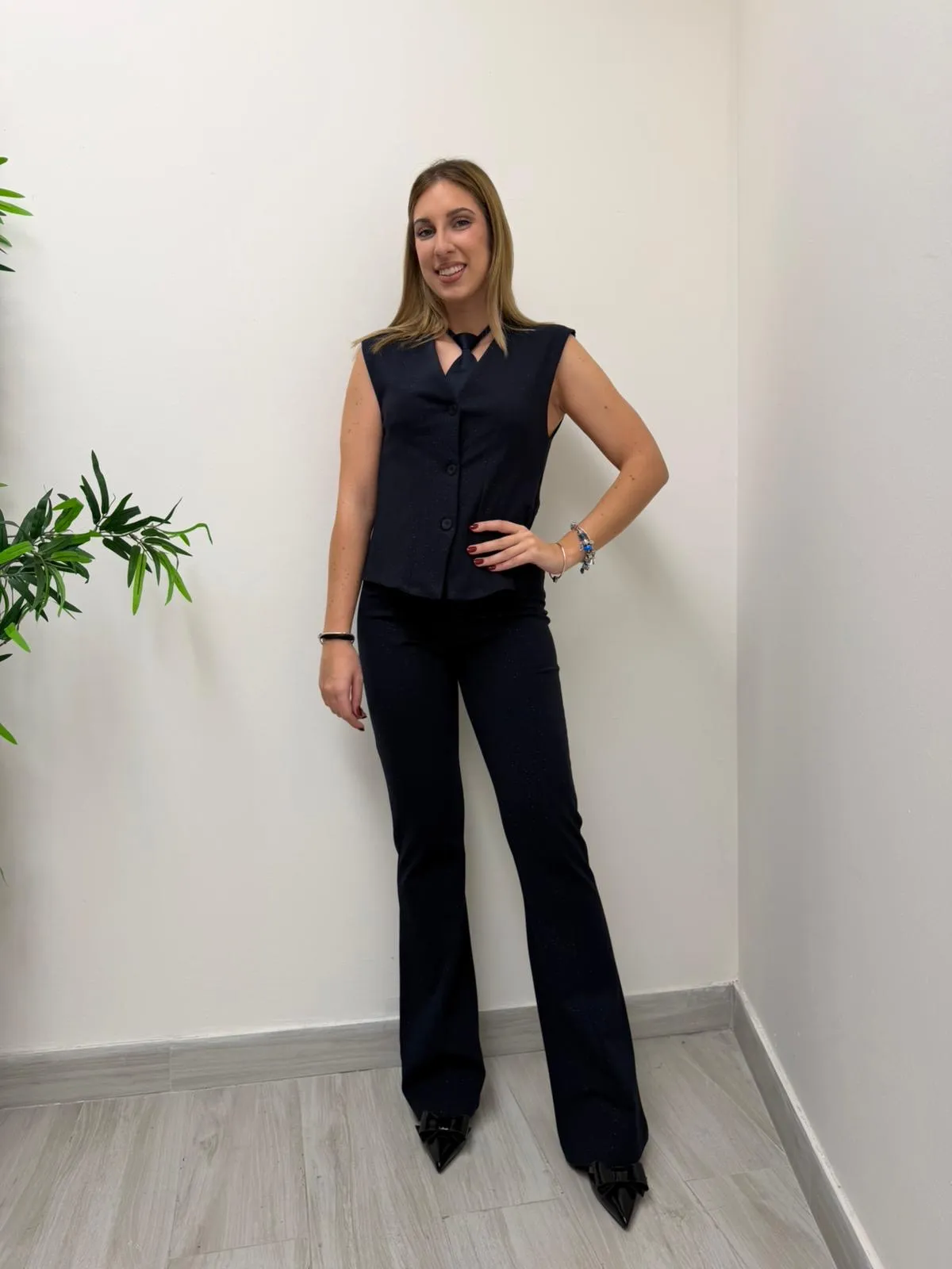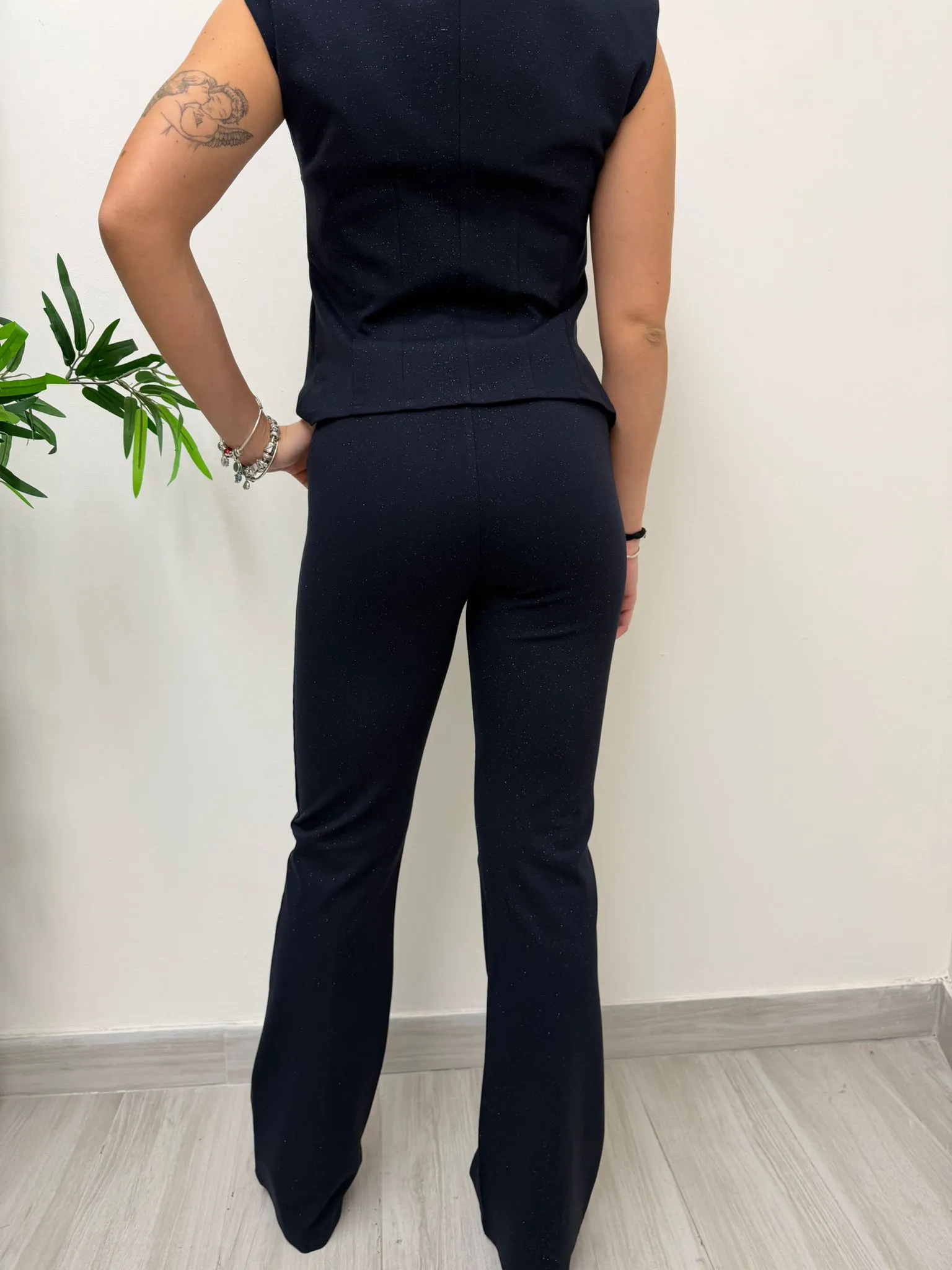 Completo formato da gilet con spalline interne e pantalone elasticizzato.Entrambi presentano dei glitter.