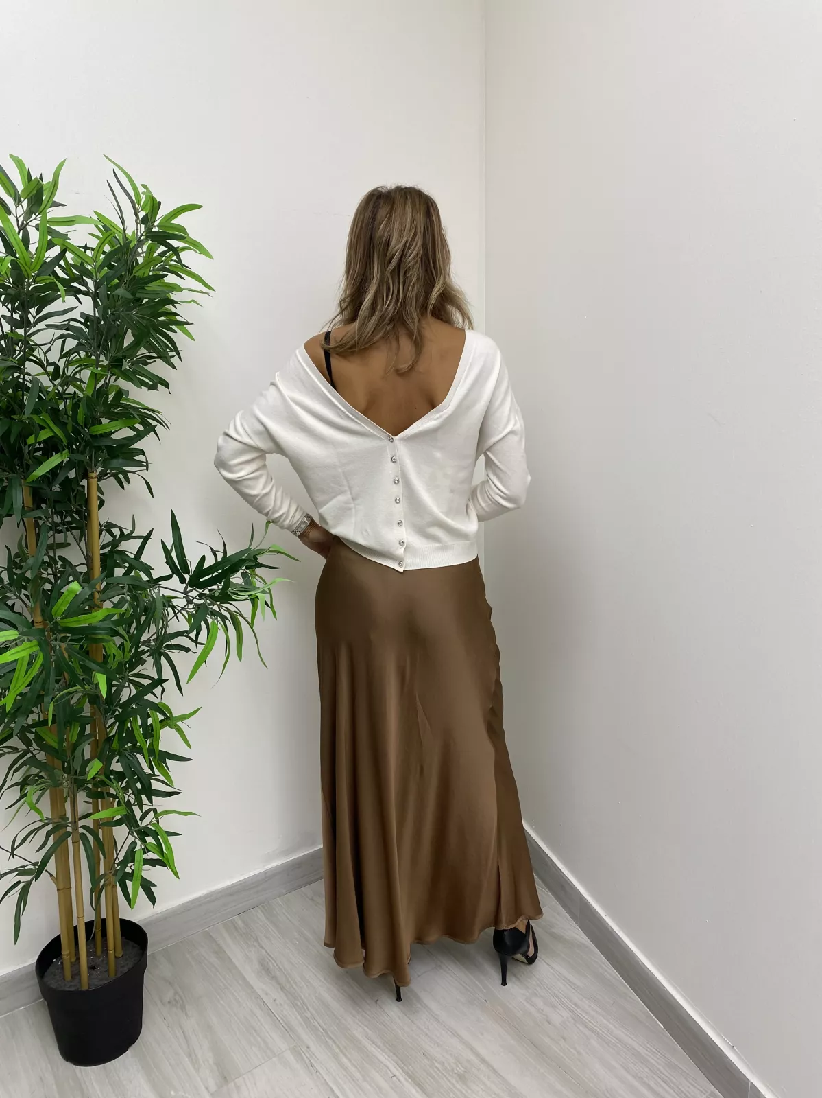 Gonna marrone lunga in raso , elasticizzata in vita.