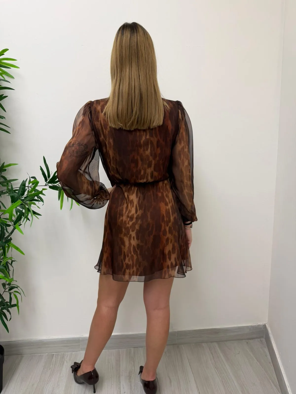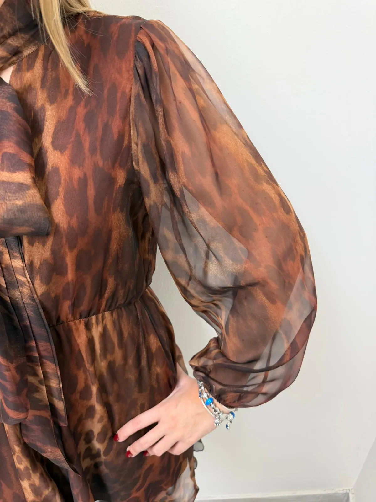 Vestito maculato con fiocco davanti. Presenta spalline imbottite e manica velata.